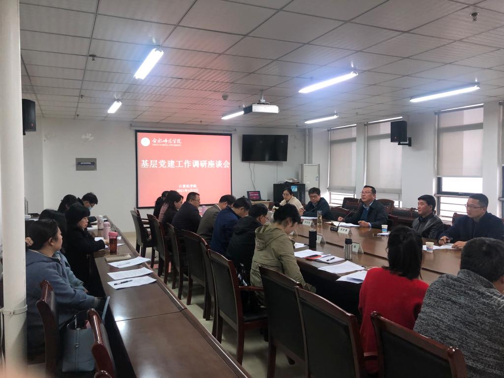 为深化巩固巡视整改成果,全面了解我院基层组织建设情况,4月2日下午校党委书记徐成钢、党委副书记吴昕春、组织部部长华银峰及组织部余军、张婉玉一行来到我院就基层党建工作进行专题调研。本次调研座谈会在计算机学院党员活动室进行,会议由组织部部长华银峰主持,计算机学院党委委员、党支部书记和教师党员代表参加座谈会。